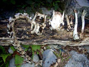 | 焚き火でイワナを炙る。火の大きさに合わせてこまめに調節する。 | 大ちゃんが見つけたカモシカ1頭分の骨。背骨はちゃんと繋がっている。 |