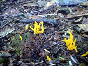 | ブナの葉のオトシブミ。チョッキリゾムの卵が中に一つ入っている。 | 鮮やかな黄色は、腐食した木に生えていたニカワホウキタケ。 |
