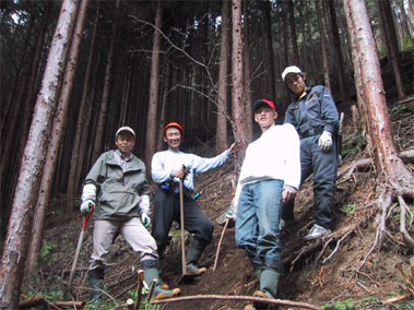 | 渡部さんがどうしてもサクラを植えたいと言い、山からチョウジザクラを掘ってきました。 | kazuyaさんの指導で移植作業をしているところです。斜面がきついので大変です。 |