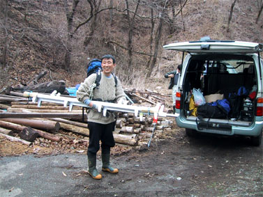 | 朝一番にはしごを担ぎ上げる渡部さん。アルミ製の二本継ぎ4メートルはしごです。 | 山登り前のみきちゃんとしゃあさん。しゃあさんの手にはガソリンとオイルが。 |