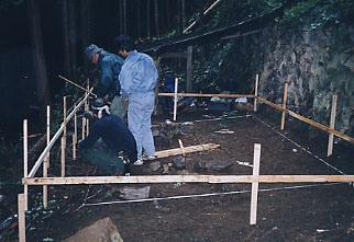 | 3人で仮小屋を4メートルほど移動しました。持ち上げて引きずるという力業です。 | 下の白いひもが縄張り。レベルを使って垂直にくい打ちします。 |
