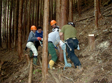 | しゃあさんの間伐作業。作業中はヘルメットをかぶりましょう。 | みきちゃん大奮闘。なんと、ヒノキを6本も倒しました。脱帽! |
