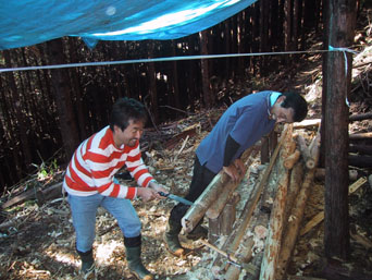 | 壁ログの長さを修正するわたるさんと渡部さん。初めての作業だから大変です。 | 山口さんとしゃあさんコンビは慣れた手つきで作業が進んでます。 |