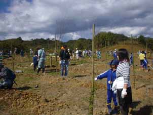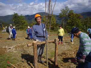 | 植樹作業の始まり。小学生も元気いっぱいに手伝っている。 | サクラを植えている岡田さん。 |