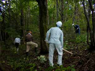 | 午後の天然林育成作業をする健さん。 | 藪のような小木を伐採して見通しの良い森にする作業です。 |
