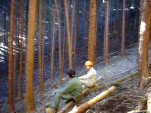| 3人でやる間伐は体がきつい。ちょっと休憩中。 | 間伐した丸太を玉切りして薪の材料作り。 |