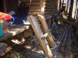 | 朝は一人だったので、枯れ枝を拾って焚き火をしました。 | 置いてあった丸太を玉切りして薪割りをしました。 |