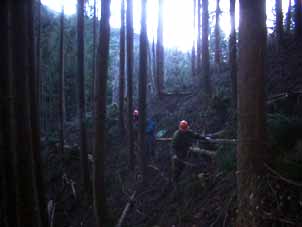 | 倒した杉の枝をきれいに処理してかたづけます。 | 次はどれを切ろうか・・・間伐の選木中です。 |