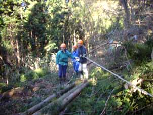 | 午後は暗い南斜面で作業です。徐々に歩道が出来上がってきました。 | ロープを持って引く方向に移動します。 |