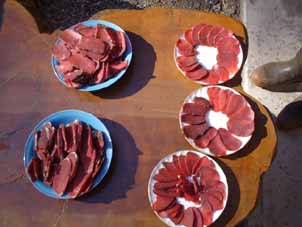 | 鹿肉の刺身と焼き肉用。これも杉田さんが捌いたもの。 | 焚き火の周りで思い思いの昼食です。 |