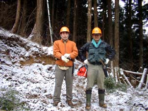 | 二日目の間伐が始まりました。 | 急斜面での作業が続きます。スギが縦に倒れると大変です。 |