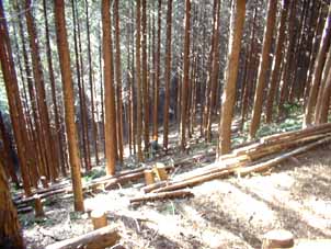 | 朝日が差し込むとヒノキ林も明るい。 | 今回もずいぶん沢山のヒノキを切った。 |