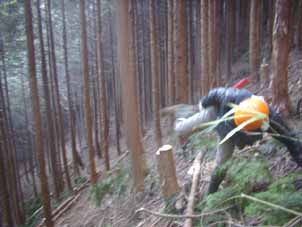 | 切り離す直前のヒノキ。枝が込んでいるのでこんな状態になる。 | 蹴り落として、引きずって倒す。 |