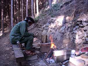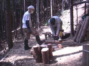 | しゃあさんが山小屋の前で薪割りをしている。 | 手鋸での間伐は体力を消耗する。 |