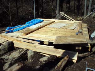 | あっという間に解体終了。 | 本組みはこの上に組み上げるそうだ。 我々は昨日残したコマ打ちのため関根山林へ。 |