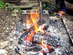 | ハミさんが昨日作った煎茶を入れてくれた。渋くて旨い小菅茶でした。 | 雨が上がったので外に出て焚き火です。 |