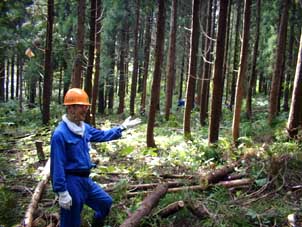| 我がチームも作業が終了してまとめの話し合いです。 | PONTAさんがきれいになった杉林を指さしています。 |