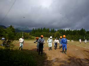 | 村の代表者と森林組合の頼もしい指導員達。 | 参加者全員が作業についての注意事項を聞きました。 |