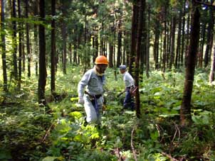 | 班分け表に従って作業する会場に移動します。 | 第6班作業地。鬱蒼とした藪になっている杉林でした。 |