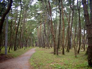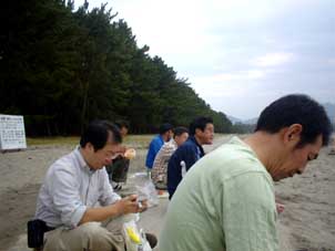| 国指定の名勝「高田の松原」ここで海を見ながら朝食を食べます。 | 松原を背に海を見ているおじさん集団。なにか、もの哀しい雰囲気。 |