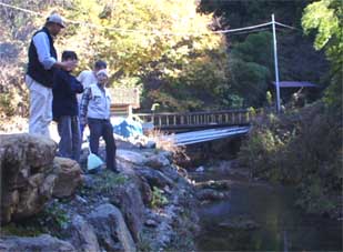 | 朝、管理棟前の川を見ながら魚の話をしている参加者。 | 薪の積み替えをしている白瀧さん。 |
