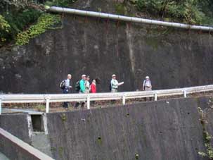 | この堰堤が林道終点になり、ここからは山道となる。 | 20分ほど登った作業地入り口。ここでしばしの休憩をとる。 |