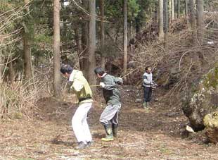 | 楽しそうな長南さん。 | 午前中はスギを何本か倒しただけでした。すぐにお昼です。 |
