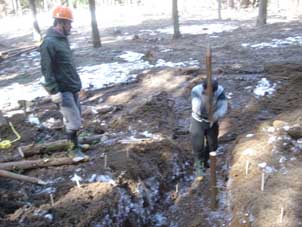 | 杭を作っている長南さんと渡部さん。 | 窯の入り口を崩さないように杭を打つ渡部さん。 |