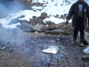 | 朝、焚き火で体を暖めます。冷たい風が吹いていました。 | ユンボで丸太を運んでいる間に煙道の縦穴が掘られていました。 |