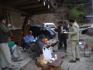 | 交代しながら薪割りが続きます。 | 冷たい風から逃げて、管理棟前でお昼にしました。 |