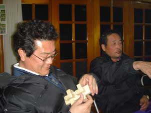 | 関根さん持参の組み木パズルに挑戦する白瀧さん。 | 同じく組み木パズルに挑戦する加藤さん。 |