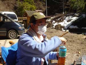 | 軒下の日だまりでまったり、タンポポ屋台さんと吉田さん。 | 花粉症で大変な状態の白瀧さん。 |