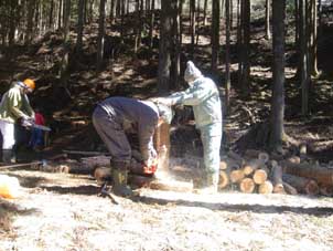 | 松の丸太をチェーンソーで切る関根さん。吉瀬さんは花粉症で大変。 | 丸太が積み上げられた作業地。 |