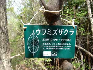 | 樹木板チェックも終えてそろそろ山を下ります。 | ウワミズザクラの樹木板が落ちていたのでフジツルで止めました。 |