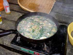 | 朝飯はカンゾウ&モミジガサ入りのパスタ雑炊です。 | いやあ、これも美味かった。 |