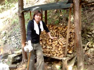 | 朝はオオルリのさえずりで目覚めました。さっそく焚き火です。 | 朝飯前のひと仕事。淺川君初挑戦の薪割り。 |