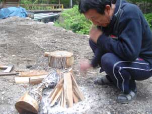 | 朝、管理棟の前に咲いていたウツギの花。 | 渡部さんが朝の焚き火を始めたところ。 |