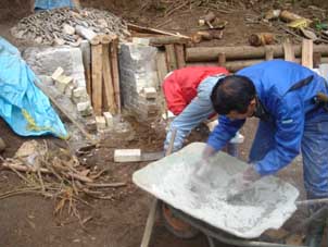 | 焚き口の仕上げをしている杉田さんと渡部さん。 | 耐火レンガを組んで焚き口の仕上げをしています。 |