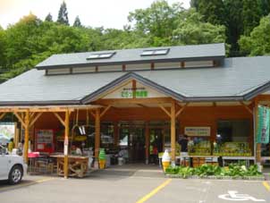| 帰りに立ち寄った「むらっこ物産館」おみやげがいっぱい。 | いつも元気なあつこさん。焼きタケノコとアスパラを頂きました。 |