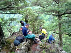 | 山の神が祀ってあるやせ尾根で大休止。もう膝がガクガクしている。 | 通称「鹿の楽園」の巨木林にて。これはトチノキ。 |