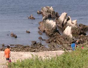 | 食べるととても美味しい。渡部さんニッコリ。 | 磯で遊ぶ人を眺めている参加者。何だか楽しそう。 |
