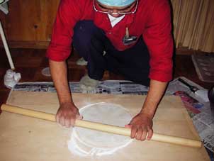 | どうですこのボリューム。いったい何種類のキノコが入っているのか。 | 1Qさんが蕎麦を打ってくれました。素人とは思えない手さばき。 |