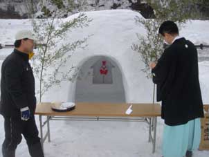 | 野村さん、加藤さん、ひらり〜さんが合流し、設営のお手伝い。 | かまくらに神様が到着し、いよいよお祭りの始まり。 |