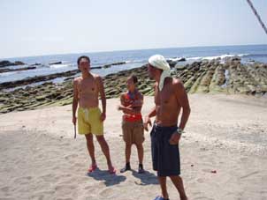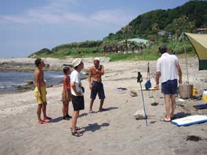 | 朝3時起きで秩父から参加の関根さん。 | 磯の浜辺にタープを張ります。 |