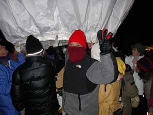 | みんなで紙風船の打ち上げを見ている。 | 初めて参加した人は幻想的な光景にただただ歓声をあげる。 |