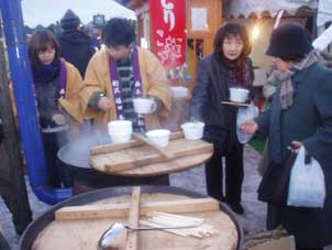 | 暖かそうな戸丸君。後輩がたくさん手伝っている。 | 琥珀さんは地元の人のようになじんでいる。 |