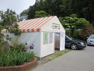 | テントが出来て看板もつけた。手伝ってくれたPONTAさん。 | 自分も同じポーズでパチリ。 |