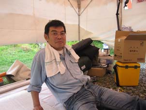 | テント設営が終わった。外観が何となくかわいい。 | 暑くてひと休みのPONTAさん。お疲れさまです。 |