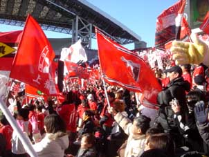 | 待ちに待ったマリッチの先制点。ゴール裏も爆発する。 | マリッチの故郷クロアチアの赤白チェッカー旗が振られる。 |