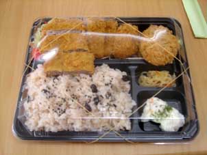 | 競技場に歩いているとトンカツ屋さんがあったので弁当を買う。 | 揚げたてのヒレカツ、温かい赤飯。げん担ぎもバッチリ。 |